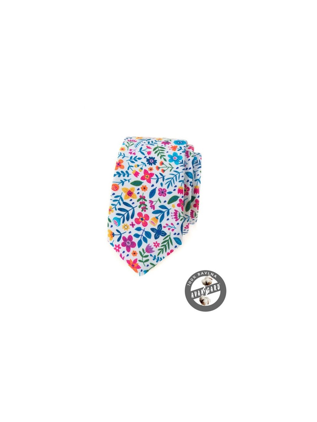 Bílá luxusní pánská slim kravata s květovaným vzorem je 5 cm široká a je vyrobena ze 100% bavlny.