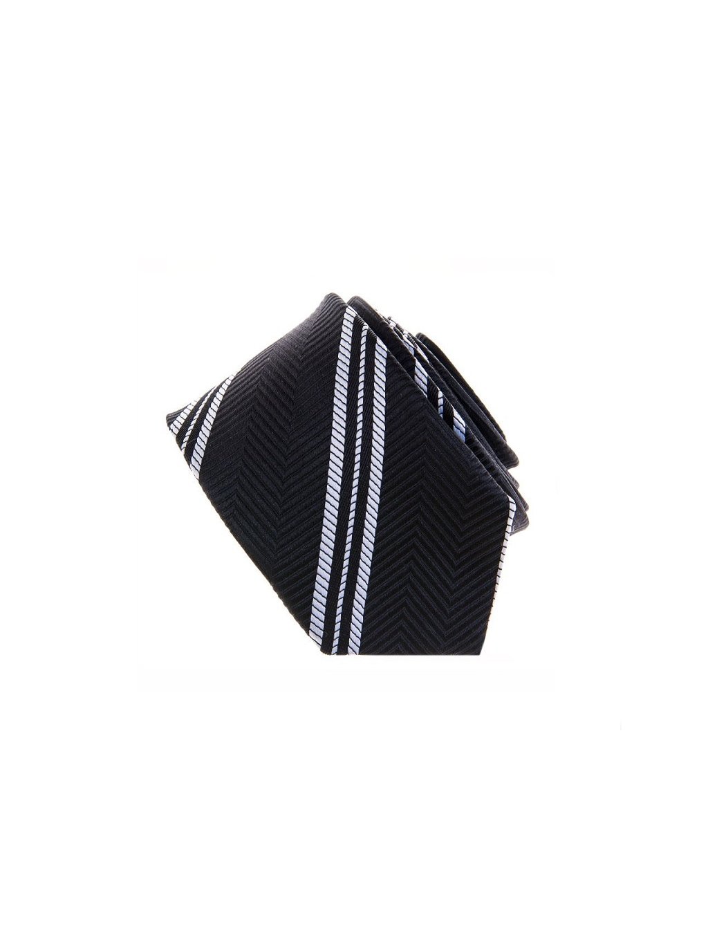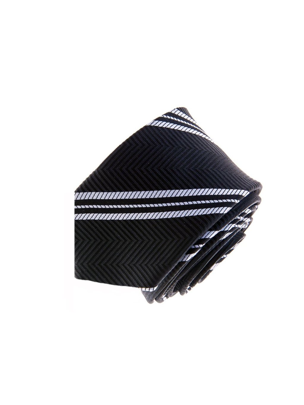 Černá slim kravata s bílými pruhy je 5 cm široká a 145 cm dlouhá.