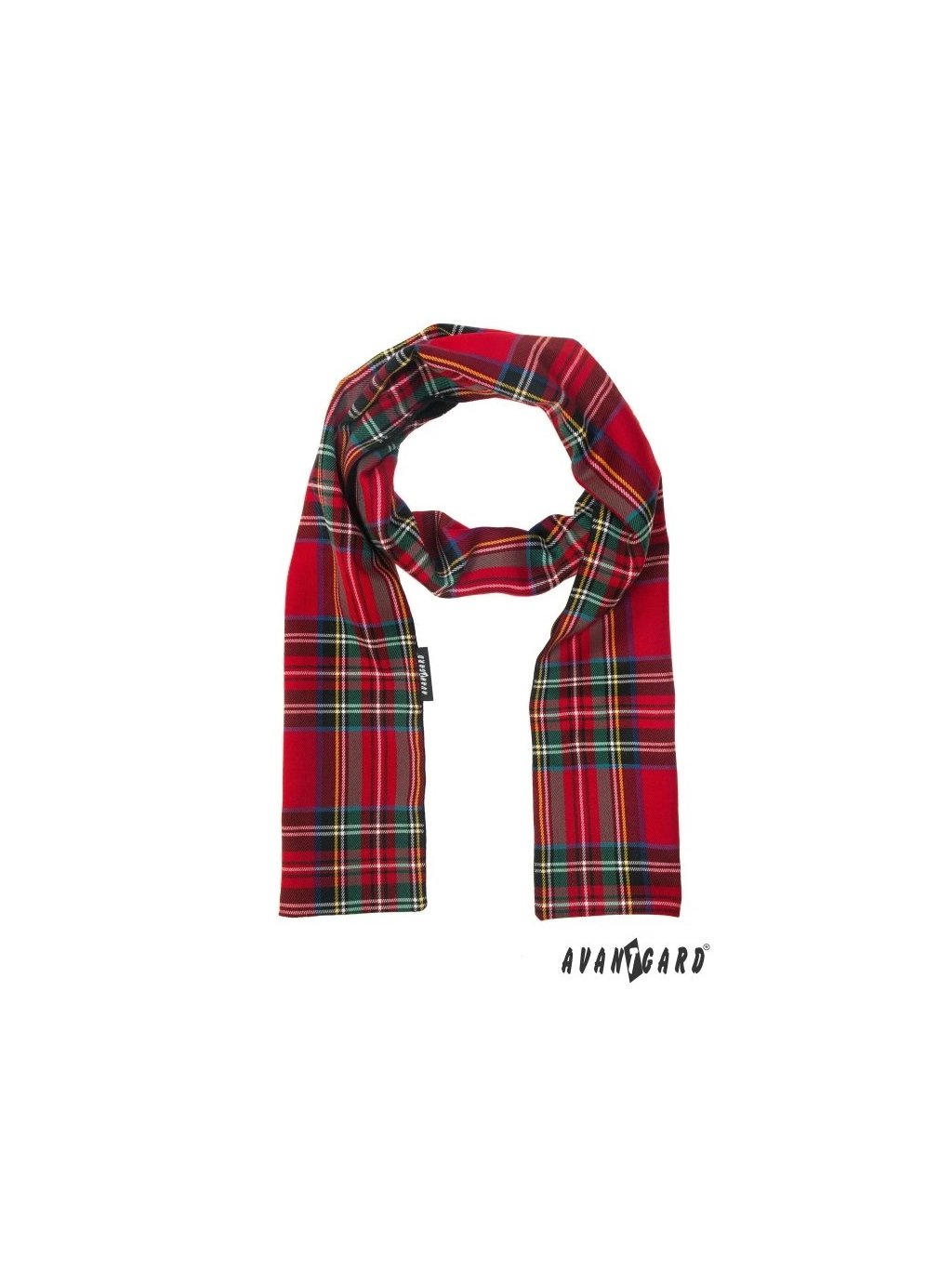 Červená pruhovaná pánská šála je vyrobena z kombinace materiálů viskóza/polyester (50/50 %).