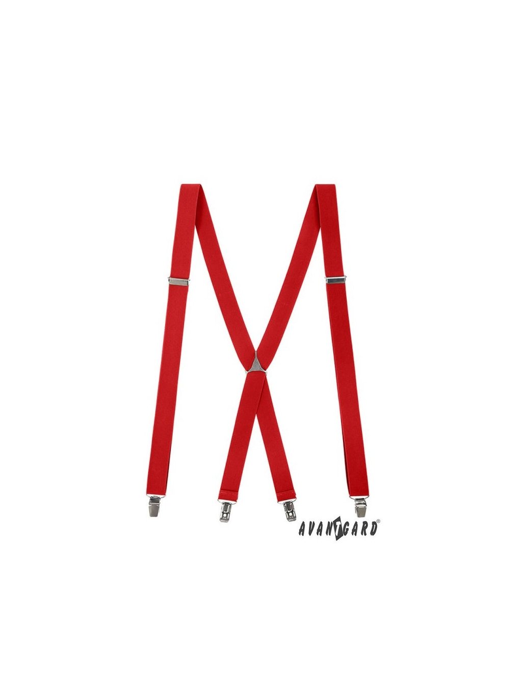 Červené pánské kšandy s kovovým středem mají uchycení na klipy.