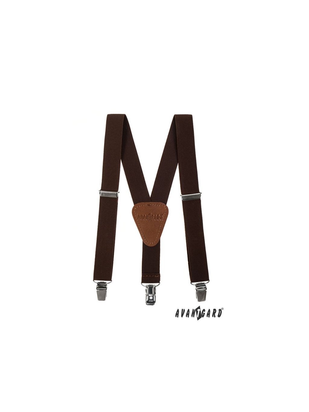 Hnědé dětské kšandy s hnědým středem jsou 2,5 cm široké, mají celokožený střed a uchycení na klipy.