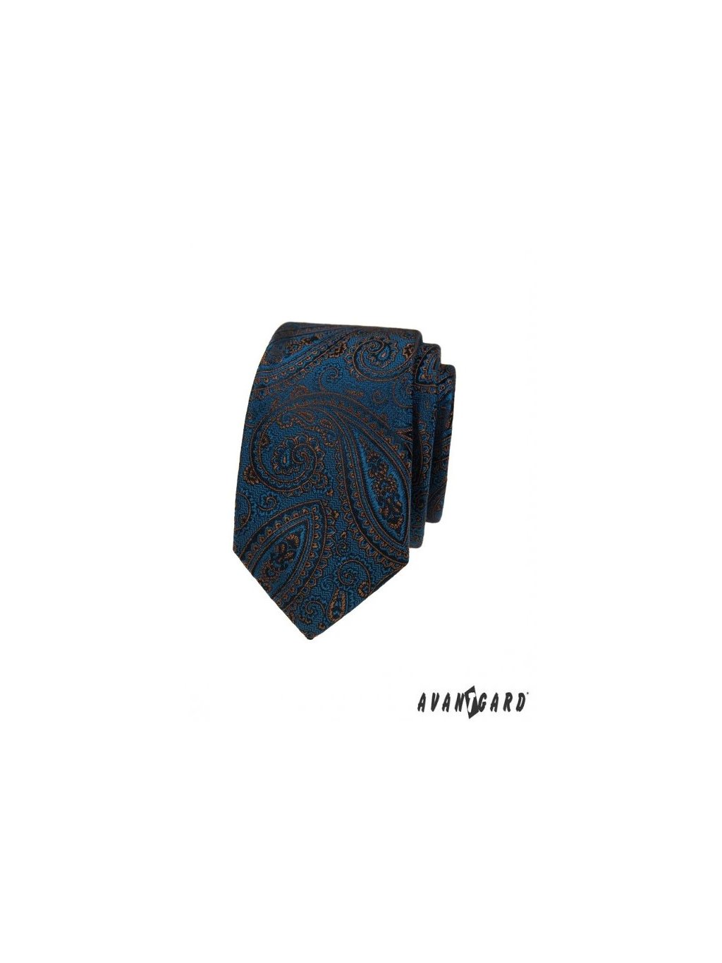Modrá luxusní pánská slim kravata s hnědým vzorem Paisley