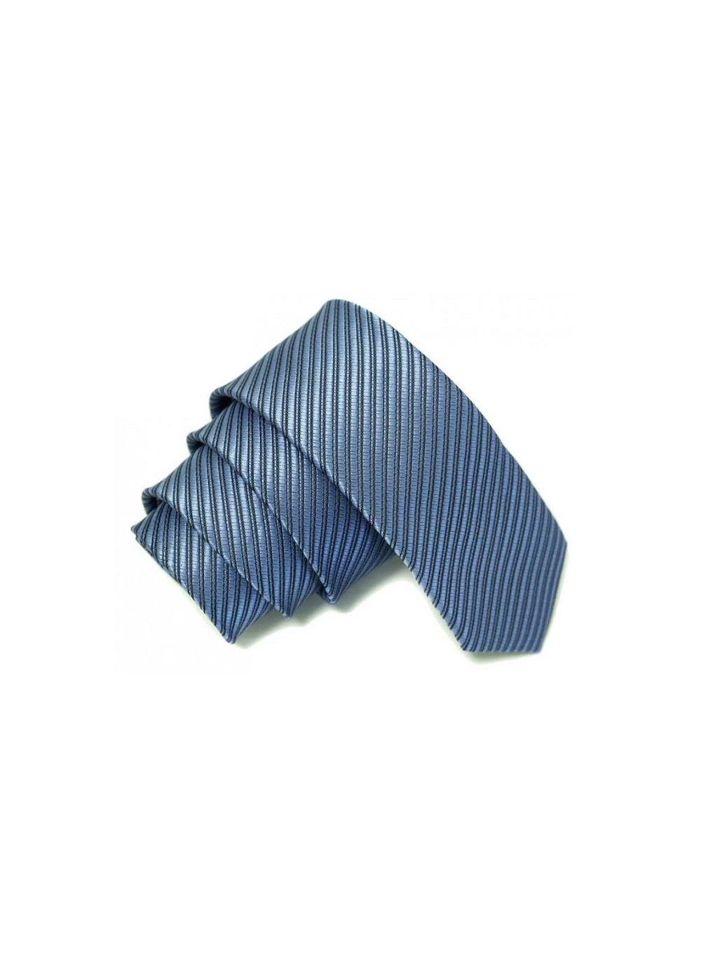 Modro-šedá slim kravata s proužkem je 5 cm široká a 145 cm dlouhá.
