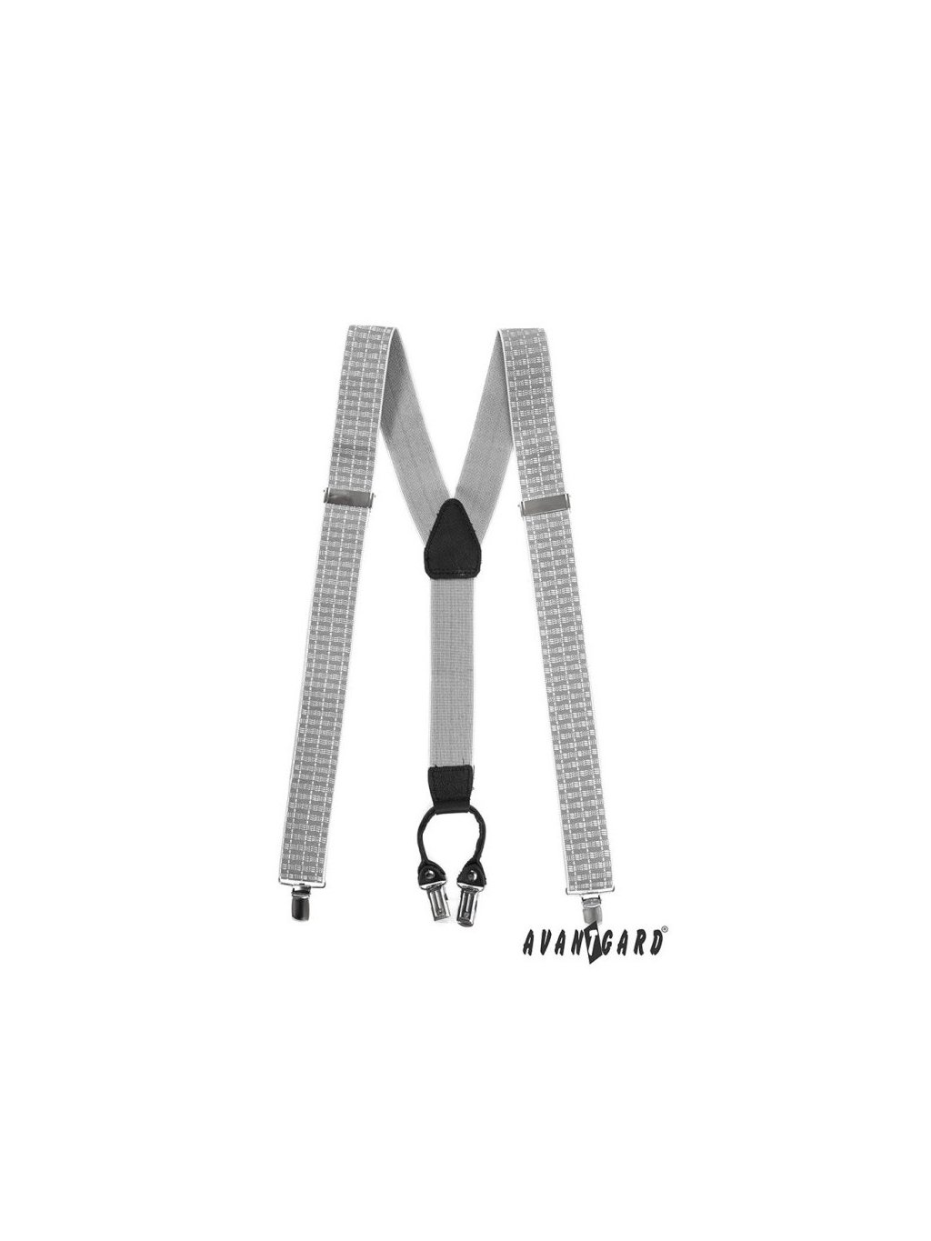 Šedé šle s netradičním vzorem v krabičce mají celokožený střed a jedná se o výrobek české značky Avantgard.