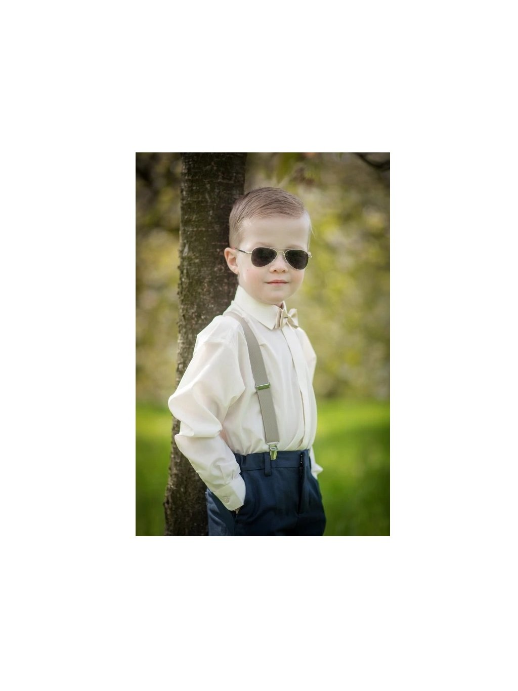 Smetanová chlapecká košile s krytou légou je vyrobena z kombinace materiálů 40% bavlna a 60% polyester.