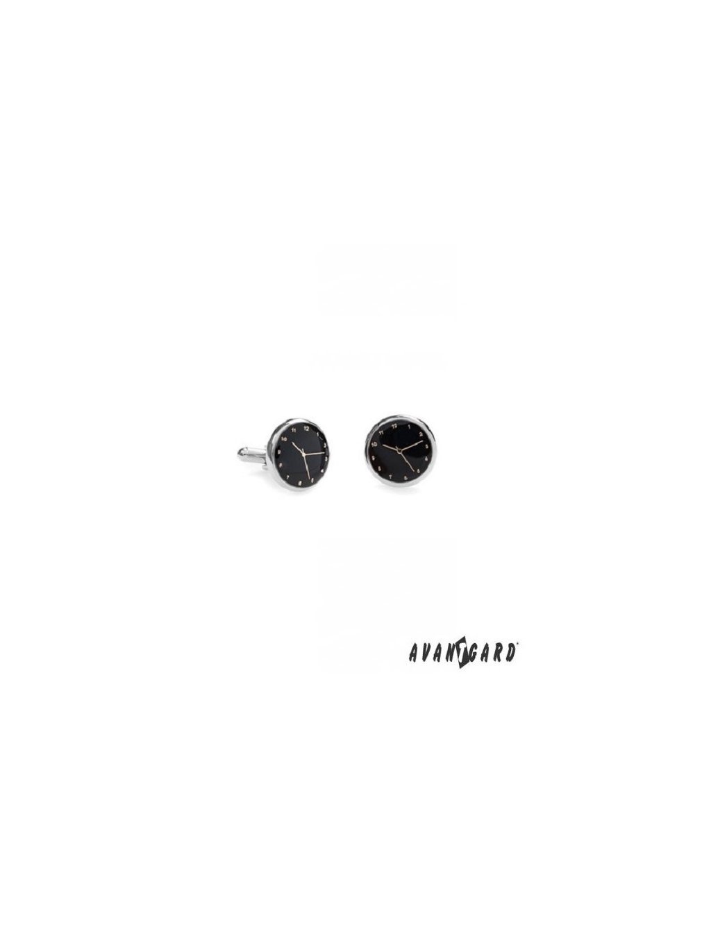 Stříbrné manžetové knoflíčky s černými hodinami jsou výrobek české značky Avantgard.