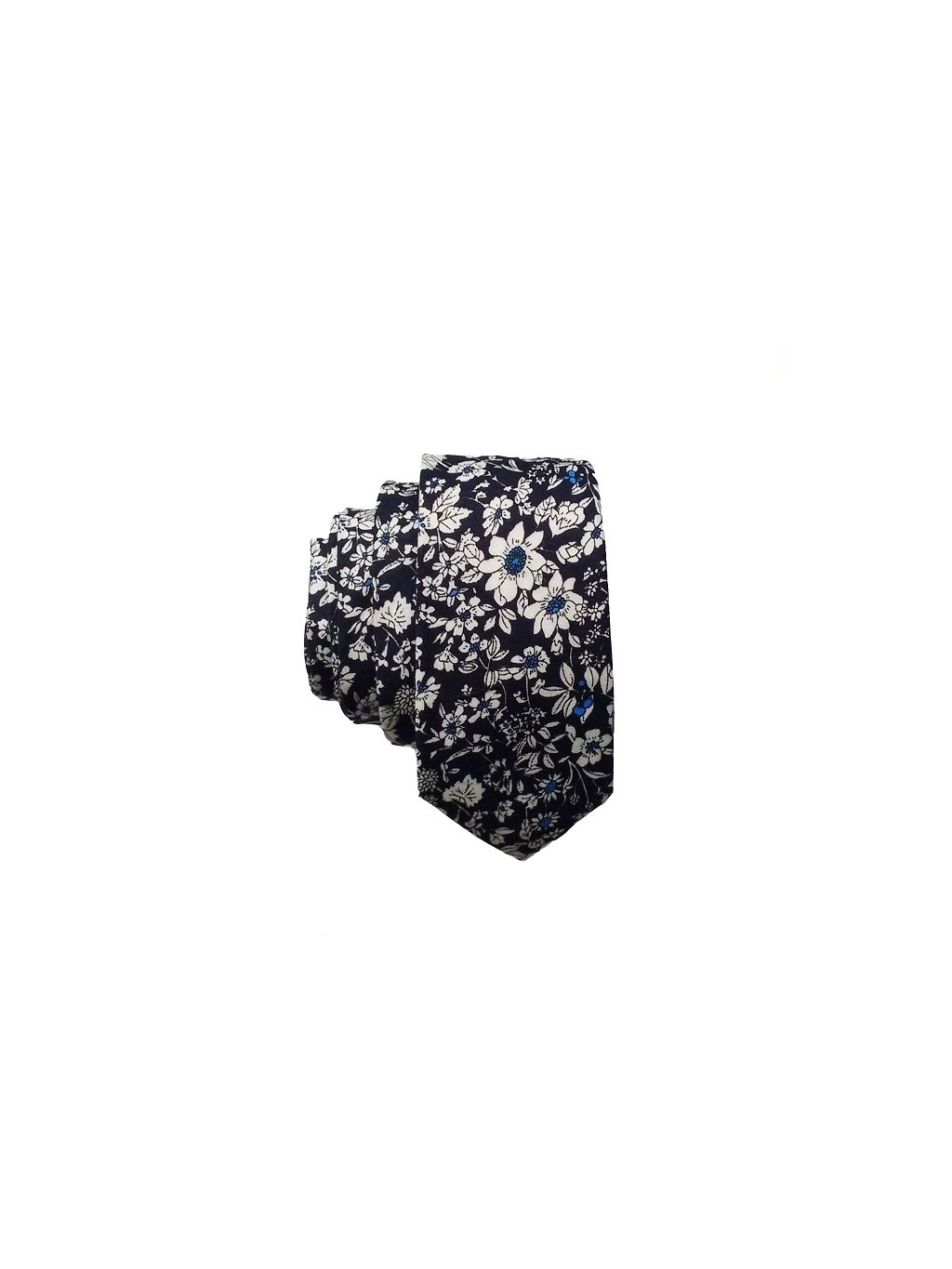 Tmavě modrá slim kravata s bílými květy je 6 cm široká a 145 cm dlouhá.