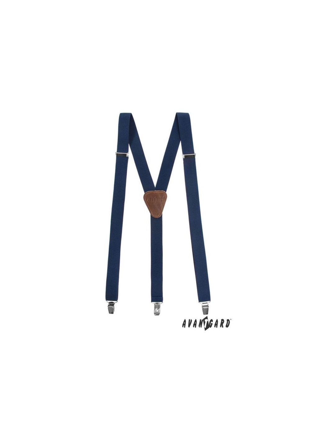 Tmavě modré pánské kšandy s hnědým středem mají uchycení na klipy.