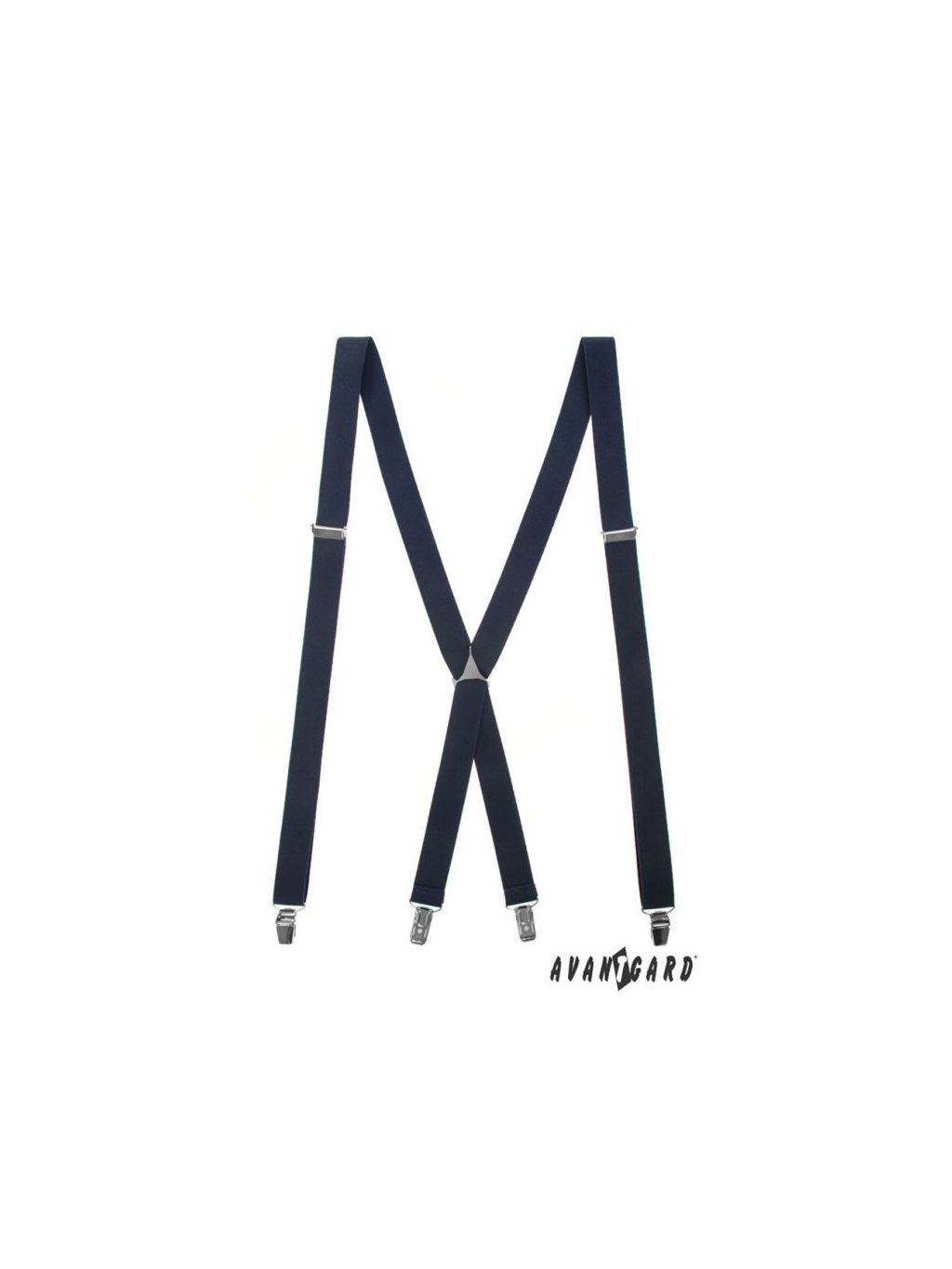 Tmavě modré pánské kšandy s kovovým středem mají uchycení na klipy.