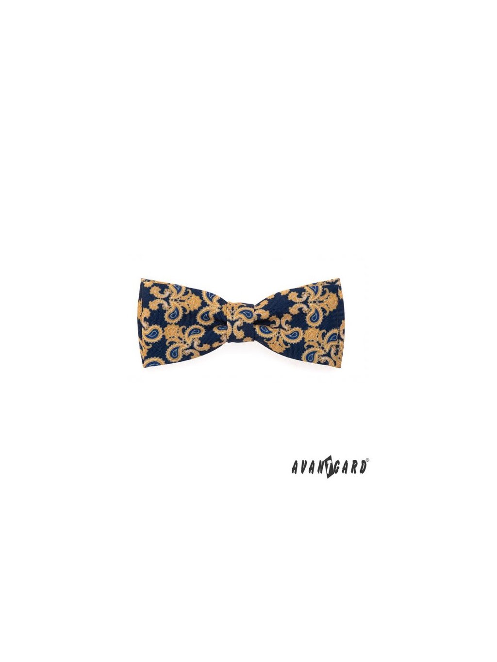 Tmavě modrý společenský motýlek se žlutým vzorem je 12,5 cm široký a je vyroben ze 100% polyesteru.