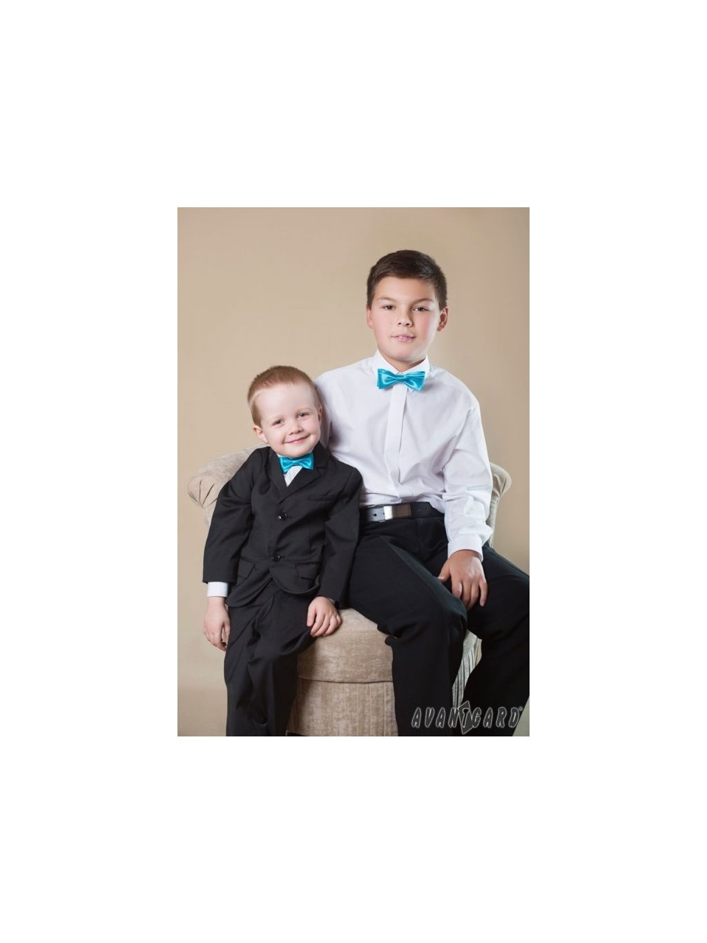 Tyrkysový dětský motýlek je předvázaný. Elegantní dětský doplněk nemusíte složitě vázat.